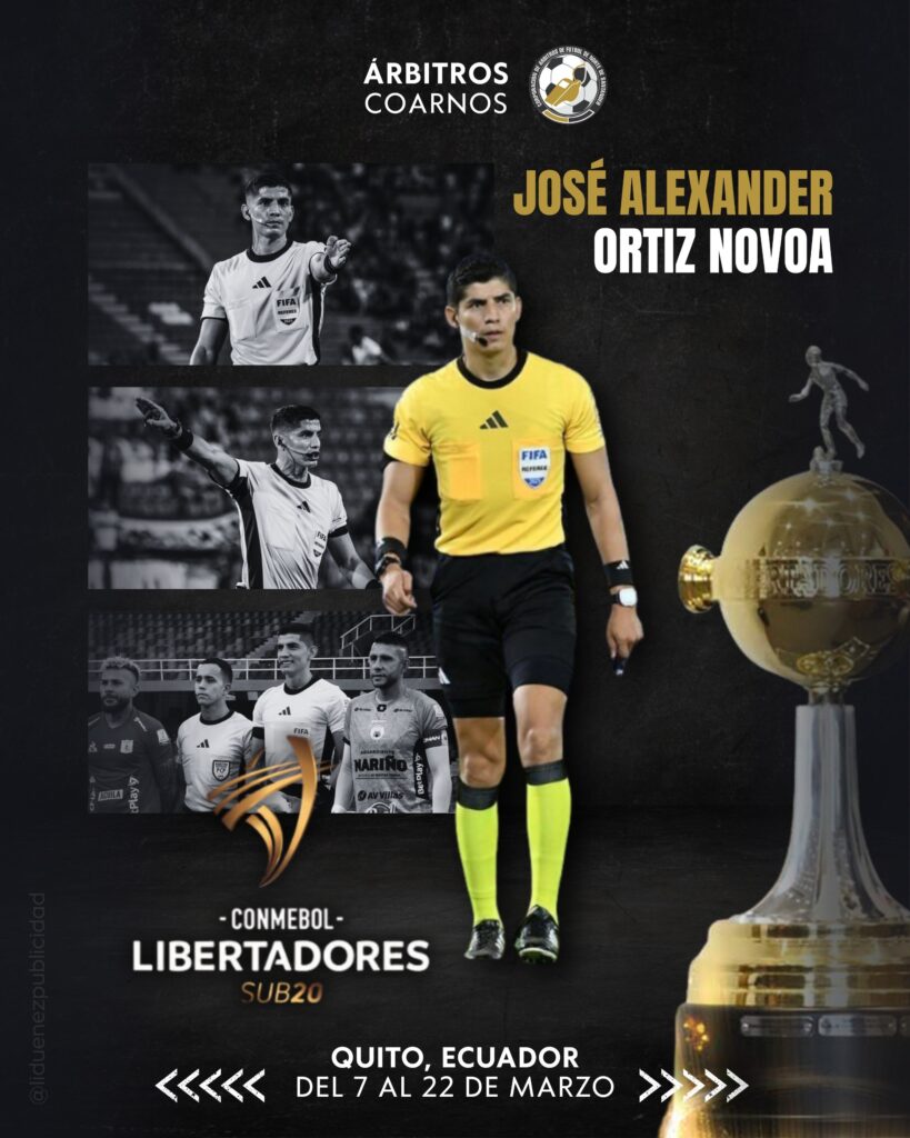 Del 7 al 22 de marzo de 2026, se realiza en Ecuador la Copa Libertadores Sub20. Para esta ocasión nuestra Corporación de Arbitros cuenta con nuestro árbitro internacional José Alexander Ortíz, quien encabeza la terna arbitral colombiana que representa el arbitraje nacional en dicha competencia.